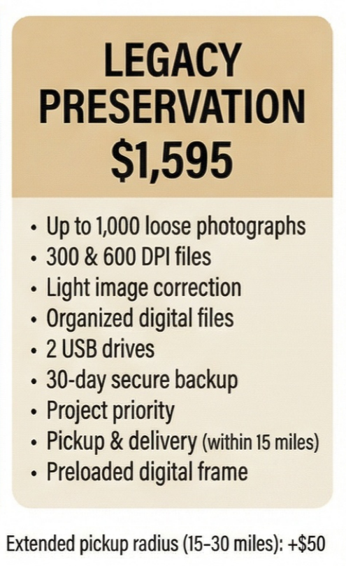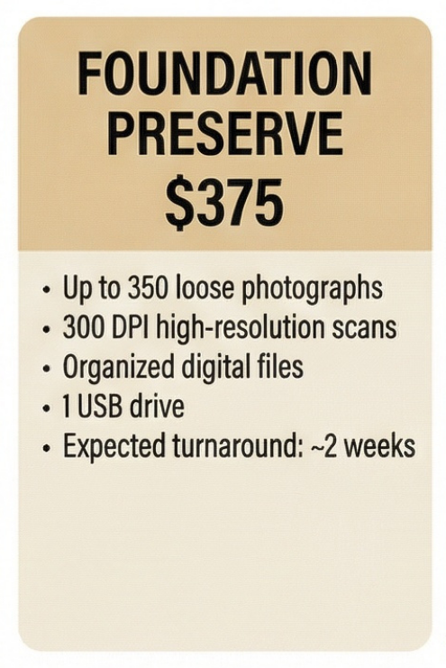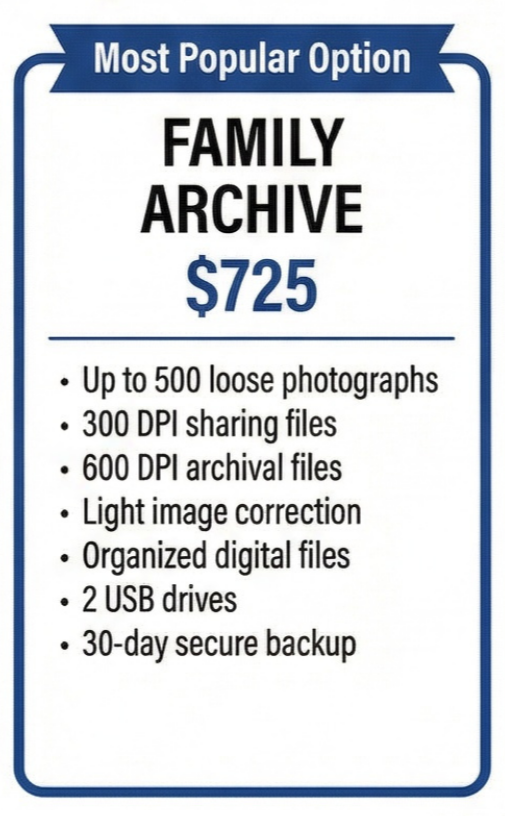 We carefully handle each photo, scanning at high resolution to capture every detail. Originals are returned safely, and digital files are organized for easy access.Can you preserve old or damaged photos?