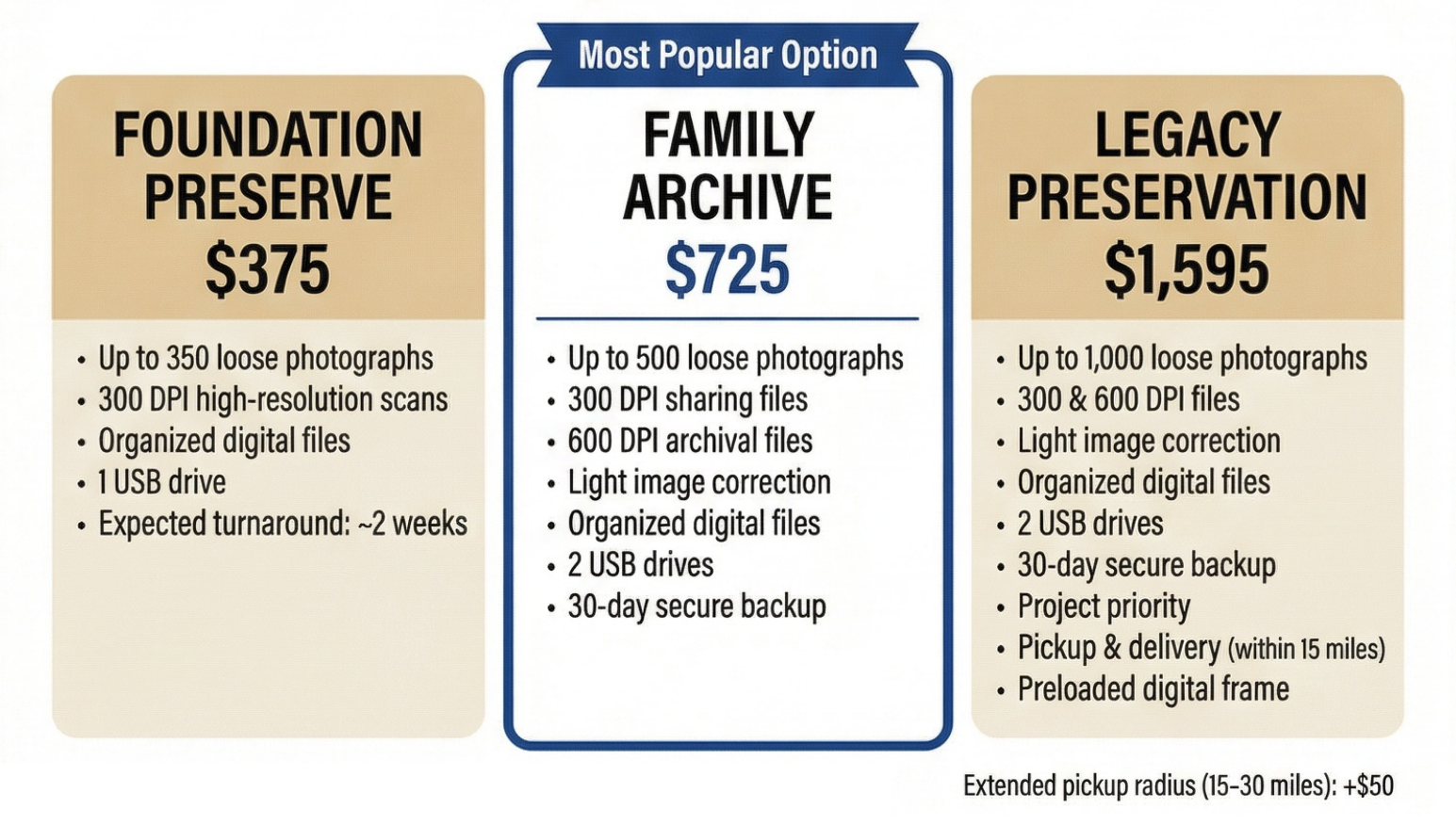 Our photo scanning service combines expert care, local attention, and high-resolution results to safeguard your family’s history.